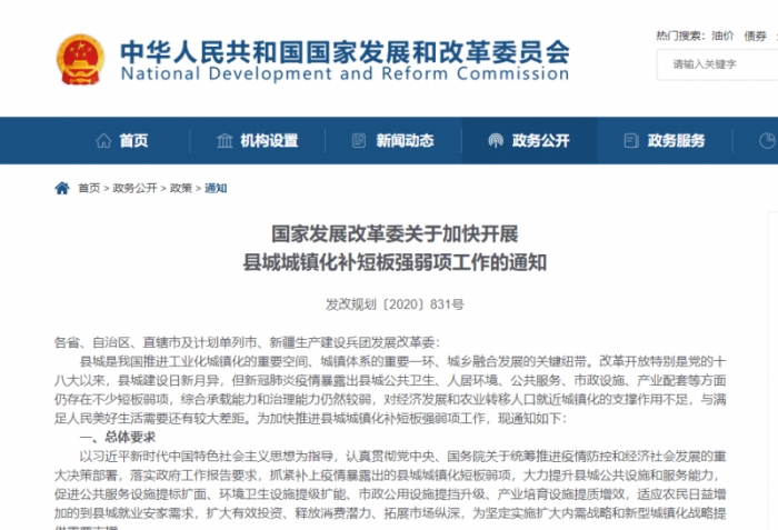 6月3日,國家發(fā)展改革委下發(fā)《關(guān)于加快開展縣城城鎮(zhèn)化補短板強弱項工作的通知》,強調(diào),開展縣城城鎮(zhèn)化補短板強弱項工作,要聚力推進17項建設(shè)任務(wù)。圍繞環(huán)境衛(wèi)生設(shè)施提級擴能,完善垃圾無害化資源化處理設(shè)施、污水集中處理設(shè)施和縣城公共廁所;圍繞市政公用設(shè)施提擋升級,推進市政交通設(shè)施、市政管網(wǎng)設(shè)施、配送投遞設(shè)施、老舊小區(qū)更新改造和縣城智慧化改造。
