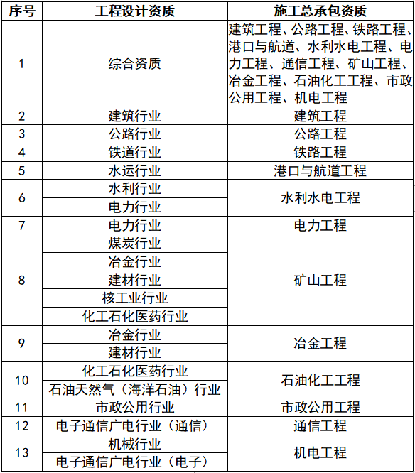 工程設(shè)計(jì)資質(zhì)與施工總承包資質(zhì)類別對照表