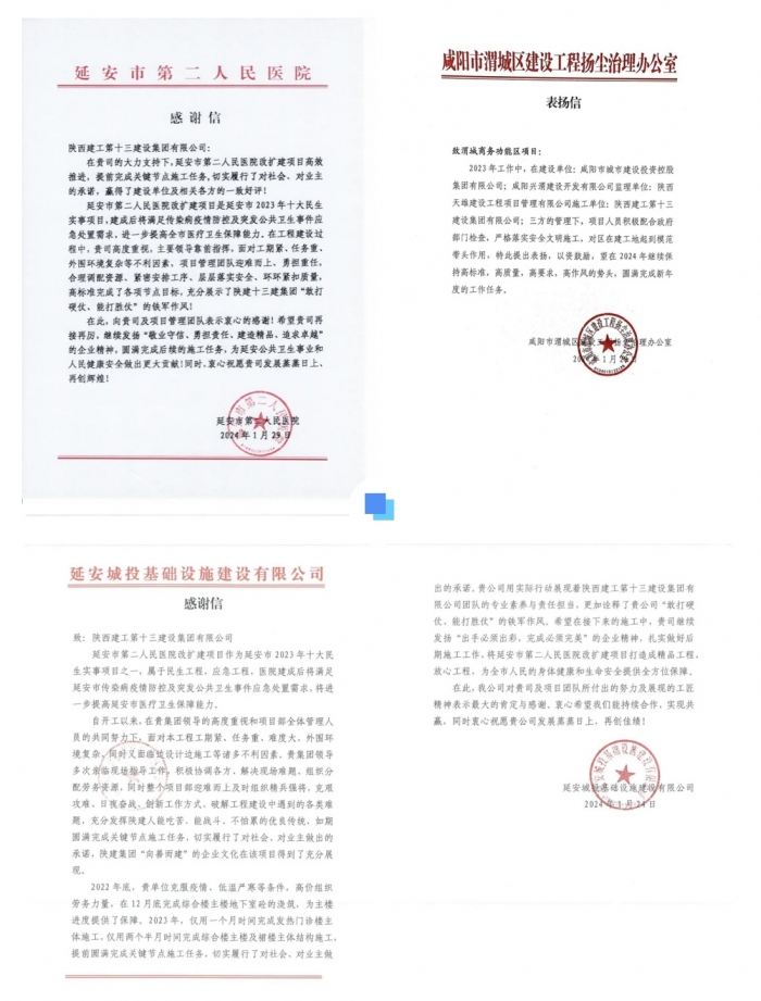近日,集團(tuán)第二工程公司施工的延安市第二人民醫(yī)院改擴(kuò)建項(xiàng)目、咸陽渭城商務(wù)功能區(qū)項(xiàng)目收到建設(shè)單位發(fā)來的感謝信、表揚(yáng)信,對(duì)集團(tuán)在項(xiàng)目高質(zhì)量建設(shè)中的傾情付出表示感謝,為項(xiàng)目團(tuán)隊(duì)在施工過程中表現(xiàn)出的敬業(yè)精神表示贊揚(yáng)。